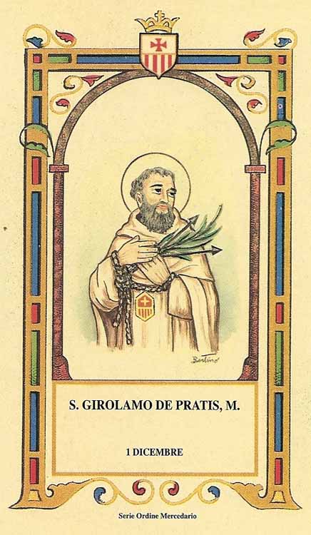 Originario d'Aragona (Spagna), San Girolamo de Pratis, appartenente al convento mercedario di Sant'Eulalia in Barcellona, fu un religioso umile, paziente, donato all'orazione ed estremamente caritatevole. Inviato in redenzione a Tunisi in Africa, iniziò la sua missione passando paese per paese alla ricerca di schiavi, alcuni perfidi mori vedendolo così risoluto nella sua fede in Cristo tentarono invano di farlo abiurare. Adirati e pieni di odio verso i cristiani lo presero e legatolo ad un albero lo trafissero di frecce; gloriosamente ricevette il martirio nell'anno 1431. L'Ordine lo festeggia l'1 dicembre.